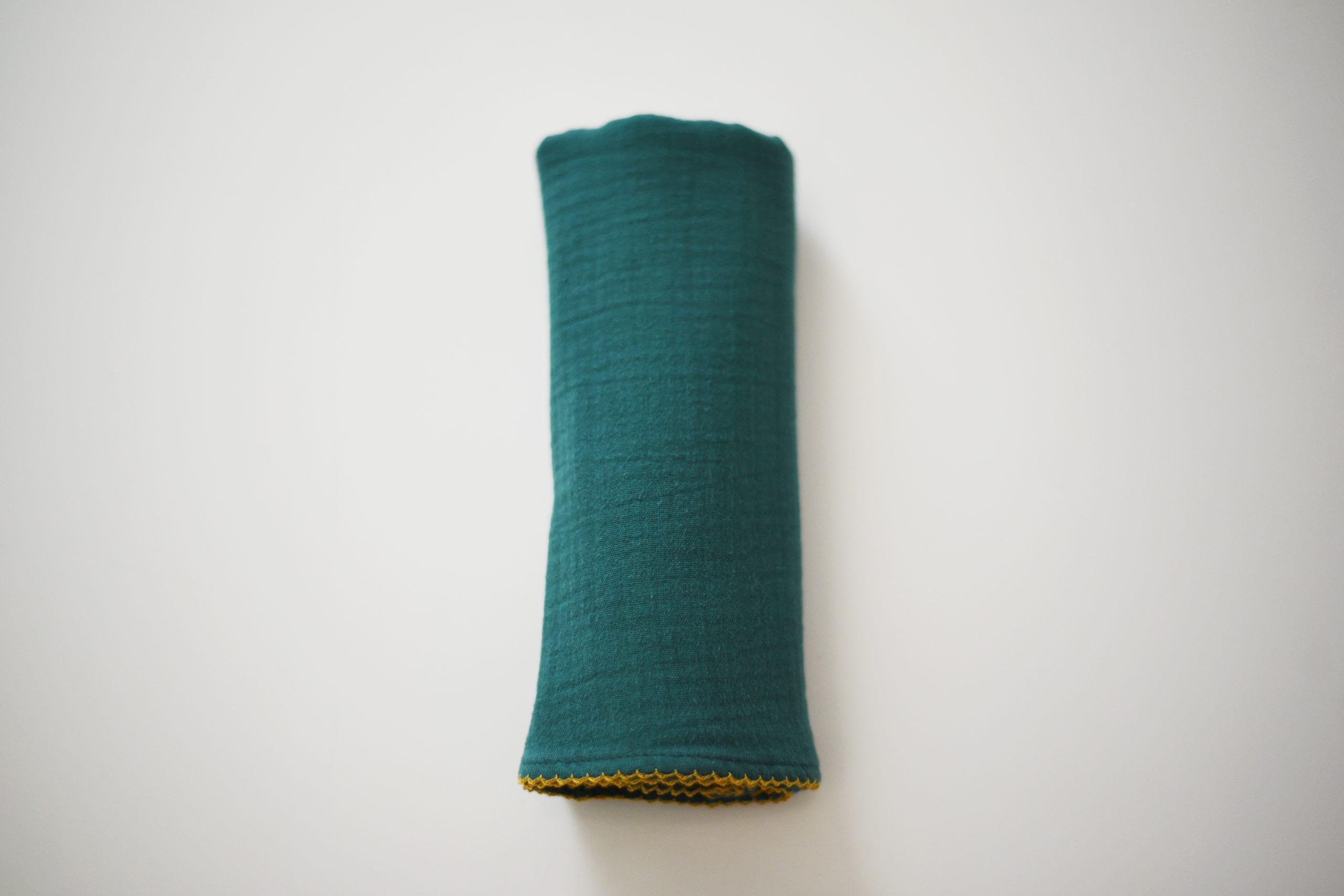 Forest green swaddle with mustard embroidery in organic cotton
